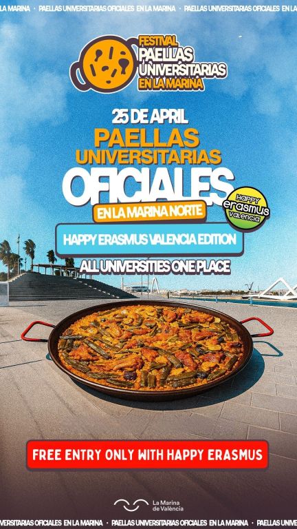Uno de los mayores festivales universitarios de Valencia vuelve. Paellas Universitarias reúne a miles de estudiantes para un día de música, paella y ambiente único en La Marina. Con Happy Erasmus tienes entrada GRATIS.